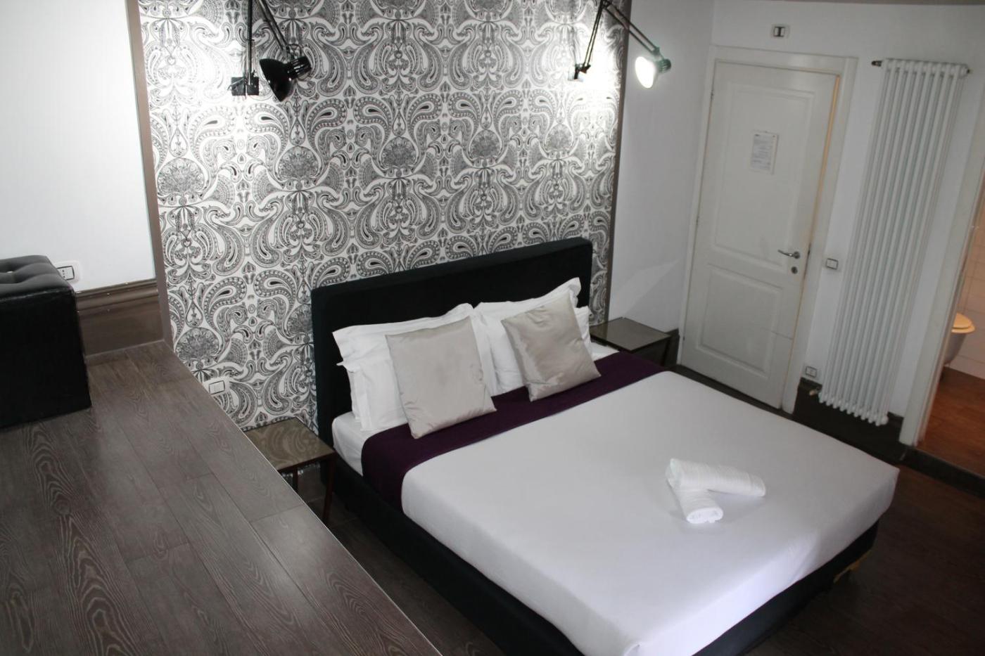 Tutte le stanze del Palazzo Taverna presentano arredi moderni personalizzati e includono un bagno privato con undi cortesia.